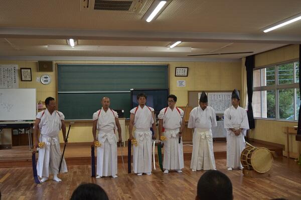 本校では、総合的な学習の時間に地元の神楽について学習しています。村所神楽、小川神楽、越野尾神楽を3年間のローテーションで学習しますので、生徒は各学年において順に学んでいきます。今年は村所神楽でした。関係者の方々においでいただいて講話や実演、体験などをさせていただきました。今月末から神楽が始まります。中には実際に舞ったりする生徒もおり、よき後継者となっています。
