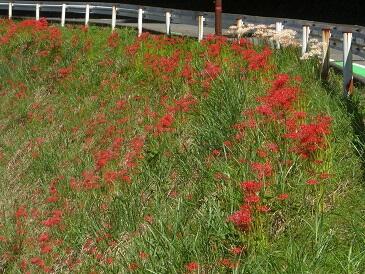 8月3日の「やまびこ花火大会」では、花火の打ち上げ場所となった学校道脇に彼岸花が満開となっています。下の川では鮎釣りをする姿もあって、いい風情です。