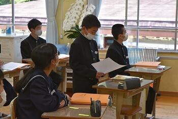 1年生に頼られる先輩になるように頑張りたい。そのために、①規則正しい生活、勉強に早く取り掛かる。②忘れ物を減らすために、毎日の細かな確認。③あいさつ日本一、西米良のあいさつを広めたい。