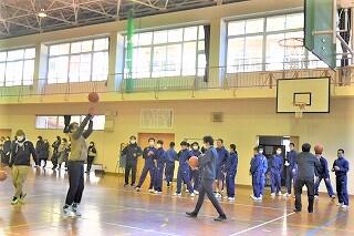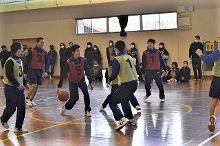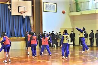 1時間目の参観授業では、全校体育でバスケットボールの授業が行われました。まだ朝の寒さの残る体育館内、準備体操やシュート練習、チームごとの作戦会議が終わり、いざ試合が始まるとチーム内でボールを呼ぶ声や、見ている生徒たちからの応援の声で一気にヒートアップ、体育館内は熱気に包まれました。授業の最後には、生徒vs保護者代表でフリースロー対決が行われ、僅差で生徒たちが勝利。本当に何事にも一生懸命に取り組む生徒たちです。