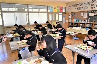 2月28日(火)の給食は、西米良伝統、年1回の「バラエティ給食」でした。いろいろなおかずが大皿に盛ってあって、生徒たちは、自分のお盆に食器をのせてテーブルを回りながら取っていきます。もちろん、好きなおかずを独占することできません。(数が決まっています。)それでも、まるでホテルのバイキングみたいで、生徒たちはとても楽しそうでした。