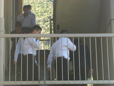 ↓ 煙霧体験の注意を廊下で聞く生徒(廊下にも煙が充満しています)