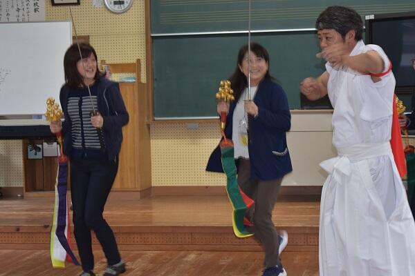 本校では、総合的な学習の時間に地元の神楽について学習しています。村所神楽、小川神楽、越野尾神楽を3年間のローテーションで学習しますので、生徒は各学年において順に学んでいきます。今年は村所神楽でした。関係者の方々においでいただいて講話や実演、体験などをさせていただきました。今月末から神楽が始まります。中には実際に舞ったりする生徒もおり、よき後継者となっています。