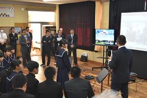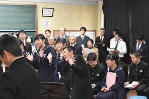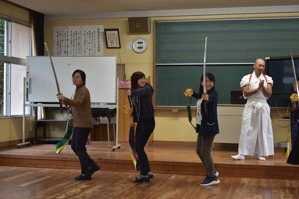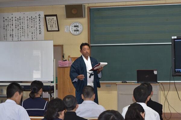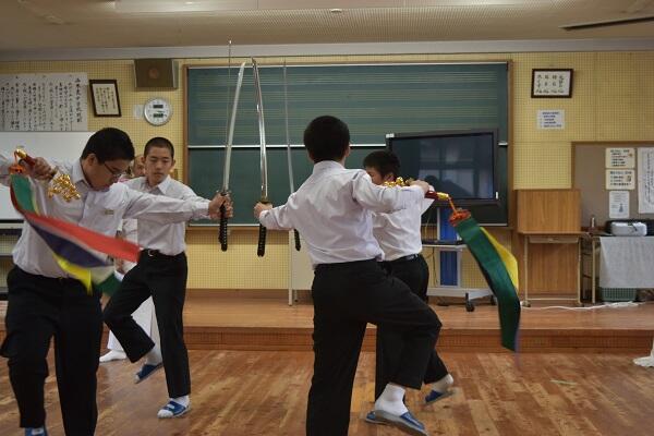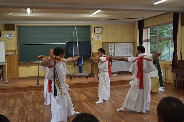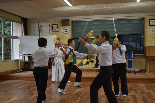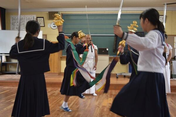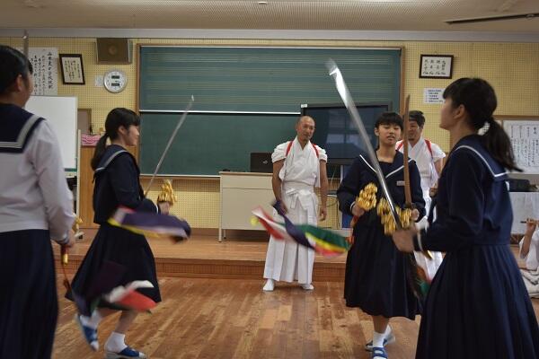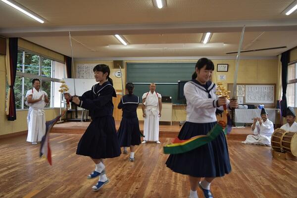 本校では、総合的な学習の時間に地元の神楽について学習しています。村所神楽、小川神楽、越野尾神楽を3年間のローテーションで学習しますので、生徒は各学年において順に学んでいきます。今年は村所神楽でした。関係者の方々においでいただいて講話や実演、体験などをさせていただきました。今月末から神楽が始まります。中には実際に舞ったりする生徒もおり、よき後継者となっています。