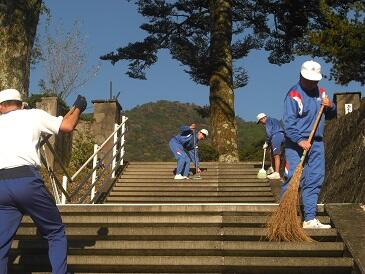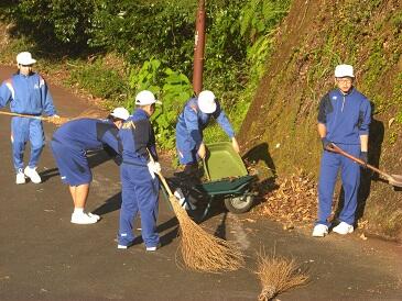 毎年恒例の行事ですが、一昨年からは研究公開が始まったこともあり、来校者を迎える準備にもなっています。落ち葉は後から後から落ちてくるのできりはありませんが、「共汗」「共働」という言葉もあるように、生徒と職員がみんなで同じ作業をすることにも意義があります。来校者を迎えるという心の準備もできてきます。