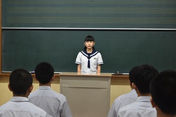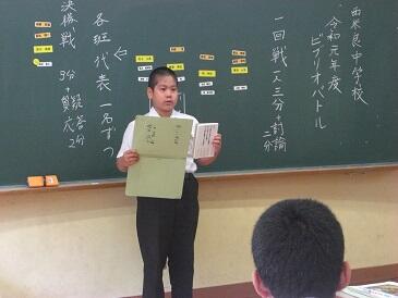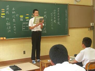 2校時の国語は、全校生徒で「ビブリオバトル」をやっていました。4班に分かれて、自分が読んだ本を紹介します。各班の代表者を1名ずつ決めて、代表4名による決勝戦を行います。それぞれが選んだ本のよさが伝わってきて、読んでみたいと思いました。