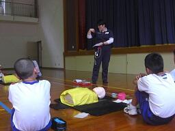 日本赤十字社県支部から講師をお招きして、胸骨圧迫や人工呼吸、AEDの使用方法などを指導していただきました。毎年実施していますので、2・3年生は復習になったようです。1年生は初めての体験でした。