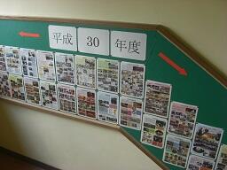 終わった行事の様子を階段横の掲示板に貼って紹介しています。今はまだ昨年度のものが殆どですが、少しずつ更新もしています。掲示物の作成の段階から今年赴任した青木先生が担当してくれています。この掲示板を見ると、今年度のこれからの行事を見通すこともできますし、「ああ、ここまで来たのか」と今の立ち位置を実感することもできると思います。入学式でも話しましたが、中学校生活の3年間が過ぎていくのは速いです。
