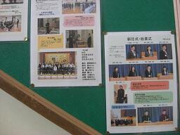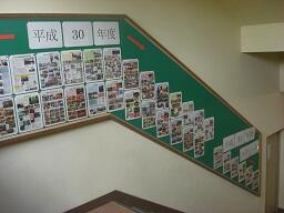 終わった行事の様子を階段横の掲示板に貼って紹介しています。今はまだ昨年度のものが殆どですが、少しずつ更新もしています。掲示物の作成の段階から今年赴任した青木先生が担当してくれています。この掲示板を見ると、今年度のこれからの行事を見通すこともできますし、「ああ、ここまで来たのか」と今の立ち位置を実感することもできると思います。入学式でも話しましたが、中学校生活の3年間が過ぎていくのは速いです。