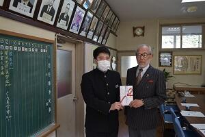 西米良村のご出身である菊池光信氏のご厚意で、毎年本校の卒業予定者の中から贈呈されている「菊池光信奨学金」が、本年度は郡山郁弥君に贈呈されました。郁弥君は生徒会長や剣道部主将を務めるなどのリーダー性を発揮してくれた生徒です。