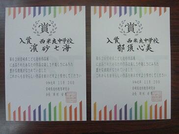県造形教育研究会主催の県こども造形作品展で、濵砂七海さん(1年)、那須心美さん(2年)の作品が入賞しました。授業が再開されてから賞状を手渡したいと思います。