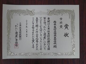 第7回「わたし遺産~私が綴る、未来に伝える物語~」(主催;三井住友信託銀行、協力;朝日新聞社)において、本校が「学校賞」をいただきました。「わたし遺産」は、未来に伝えのこしたいと思う大切な「人」や「モノ」、「コト」を、その理由やエピソードを交えて400字の文章にするものです(応募要領より)。本校は全員が応募しました。