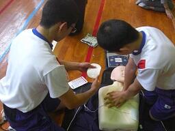 日本赤十字社県支部から講師をお招きして、胸骨圧迫や人工呼吸、AEDの使用方法などを指導していただきました。毎年実施していますので、2・3年生は復習になったようです。1年生は初めての体験でした。