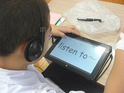 ヘッドフォンから聴こえる英語の音声をまねて、発音練習をして