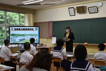 6月17日(木)に、県立高等学校4校(妻高校、宮崎北高校、宮崎大宮高校、高鍋高校)、私立高等学校3校(日章学園高校、鵬翔高校、宮崎日大高校)をお招きして、高校説明を行いました。全校生徒と保護者の方も参加していただき、本校卒業後の進路について深く考える時間となりました。