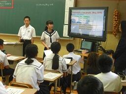 1年A組で英語の授業がありました。3月まで指導されていた小学校の先生も温かく見守っておられました。