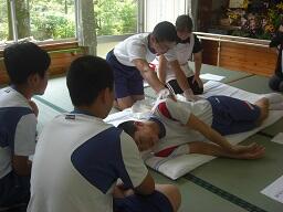 村内にある特別養護老人ホーム「天包荘」を訪問して、高齢者との交流や介助の指導をしていただきました。全校生徒が1対1でお話相手となったあと、1年生は車いすとベッドとの移行、2年生は入浴介助、3年生はおむつ交換を体験しました。天包荘の皆様にはたいへんお世話になりました。ありがとうございました。10月下旬に第2回を行う予定です。