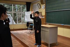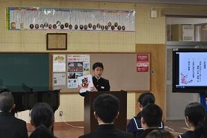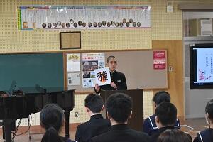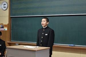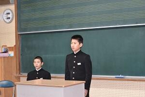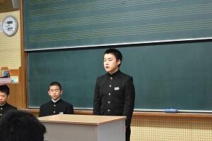 各学年代表による抱負の発表がありました。当然のことではありますが、受験目前の3年生、最上級生が迫った2年生、中学校生活のことがわかってきた1年生と、学年によって状況が随分と異なることを感じさせる発表でした。続いて、昨年と同様に「一日の計は朝にあり 一年の計は元旦にあり 一生の計は少壮にあり」という言葉を紹介して「中学生の今の時期が一生を左右するような大事な時期であること」を話しました。