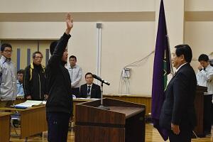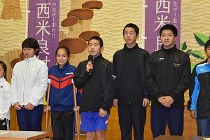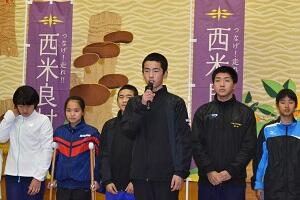 第10回宮崎県市町村対抗駅伝競走大会の西米良選手団結団式が昨日(11日)の18時から基幹集落センターで行われ、本校からは那須翼君、黒木愛莉紗さん、黒木琉偉君、那須心美さん、濵砂康生君が参加しました。康生君は選手宣誓も行いました。