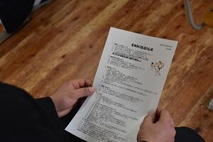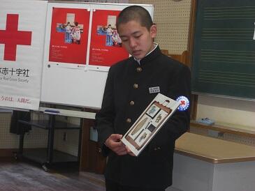 日本赤十字社宮崎県支部から講師をお迎えしてグループワークを行いました。趣旨は「災害に伴って避難する場合、持ち出すものは人や家族によって異なることを踏まえて事前に準備をすることの重要性を理解する」「準備ができていない場合は、物より命を優先することの重要性を理解する」などです。