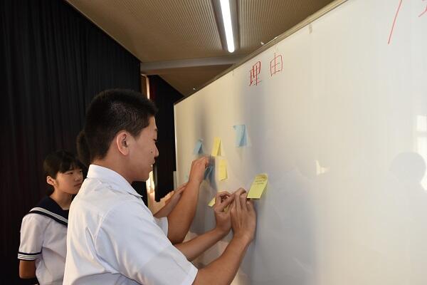 全校で道徳の勉強をしました。学年混合の班をつくって自分の考えを発表し、それぞれの考えの共通点や違い、そう考えた理由などを話し合いました。これまでと違って、道徳の授業を担任以外の先生が行うなど、道徳の授業の考え方にも変化が出てきています。今日のように、本校の特性を生かした授業にも取り組んでいきたいと思います。