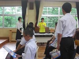 明日(5日)、村内にある特別養護老人ホーム天包荘で福祉体験活動を行います。その事前指導として、3日(月)の6校時に、福祉士と介護士の方においでいただいて事前指導を行いました。福祉や介護に関する総括的なお話のあとで、実際に介護の仕事をされている立場からの具体的なお話を伺いました。