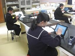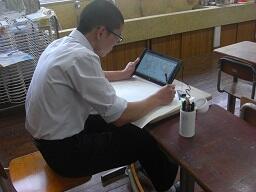 実験後のレポートを書いています。実験中にタブレットで写真を撮り、それ