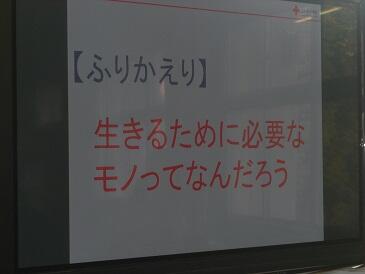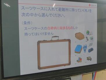 日本赤十字社宮崎県支部から講師をお迎えしてグループワークを行いました。趣旨は「災害に伴って避難する場合、持ち出すものは人や家族によって異なることを踏まえて事前に準備をすることの重要性を理解する」「準備ができていない場合は、物より命を優先することの重要性を理解する」などです。
