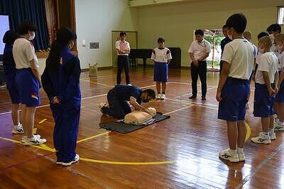 6月9日(金)に西都市消防本部の方が3名来られ、心肺蘇生法及びAED講習会が行われました。