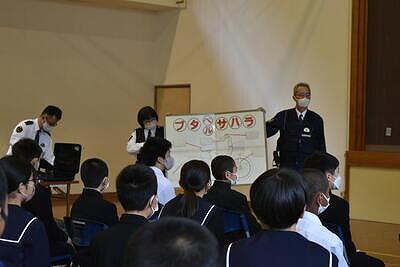 スライドによる説明では、自転車の危険性や交通ルール等について具体的でわかりやすく説明していただき、それを生徒も真剣に聞いていました。
