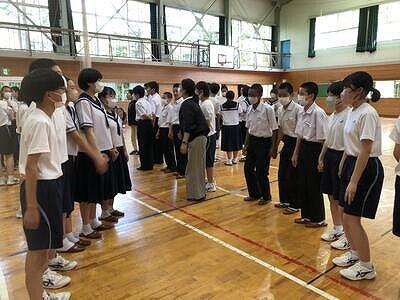 わんこそば体験後、遠野市立西中学校に移動し、交流を行いました。