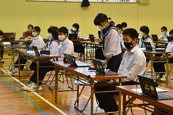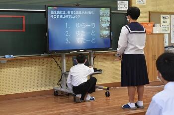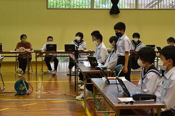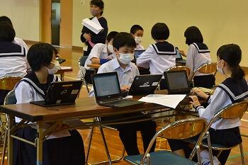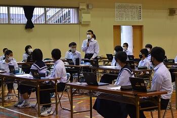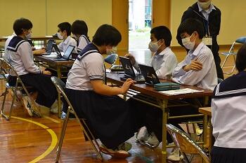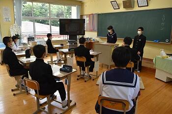 その中で、両校が学校の紹介をしたり、クイズを出題し合ったりして、お互いの地域や学校の様子を知ることができました。その他にも、レクリエーションや学級討議など、両校の生徒が交流する有意義な時間を過ごすことができました。