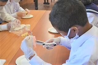 実際の収穫では、生徒たちは、はさみで傷つけないように慎重に実を切り取った後、コンテナに大切に収穫していきました。1時間ちょっとの時間でしたが、全員で一生懸命作業して、コンテナいっぱい収穫できました。