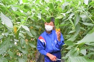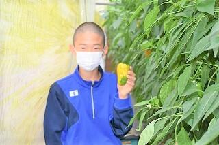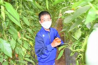 村所地区から小川地区に抜ける通称「殿様街道」の途中から入った高台にある田爪さんのビニールハウスに、みんなで行きました。最初のカラーピーマンに関する講義の中で、「なんで、このような高地で栽培されているんですか?」という生徒の質問に対して、西都市のカラーピーマンと収穫時期をずらすために、夏でも冷涼な高地で栽培されているとのこと。農家の方々の連携した努力のおかげで、年間を通して食べることをできるということを知りました。また、緑のピーマンよりも栄養価が高いこと、安心安全なカラーピーマンを作るために様々な努力をされていること等を学びました。