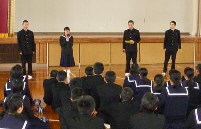 本日の朝、生徒集会が行われました。今回は、3年生が卒業していないため、少しこぢんまりとした集会となりました。