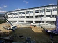 これまでずっと幕で覆われていたのですが、新校舎南側の幕と足場が撤去されました。そして、真新しい白い壁面があらわになりました。また、建物周辺の外構の工事も徐々に進んでいるようです。