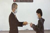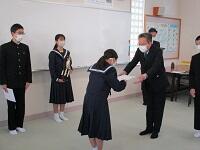 前日の任命式に続いて、今日は旧生徒会役員、専門委員長・副委員長への感謝状授与式がありました。半年間という短い期間でしたが、木城小中学校のリーダーとして頑張ってきました。生徒会長を務めた2B松田さんから振り返りの言葉がありました。選挙の運営や任命式や感謝状授与式を運営した選挙管理委員の皆さんありがとうございました。(3月10日)