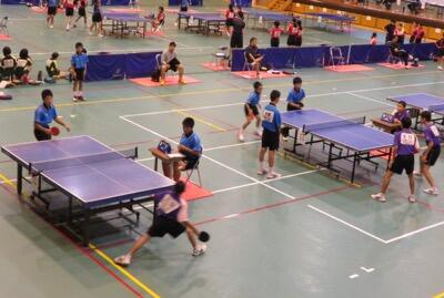 卓球は、新富町体育館で男女の団体戦が、総当たりリーグ戦で行われました。写真は第2戦で女子が妻中と(上)、男子が唐瀬原中と(下)対戦しているところです。