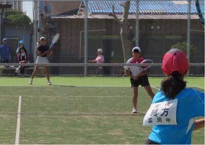 ソフトテニスは会場が変更になり、高鍋町総合体育館横のテニスコートで行われました。写真は団体戦の予選の様子です。試合をしているのは、江口・横田ペアです。