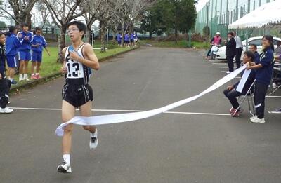 6区間で行われた、男子の駅伝は、1区の平元君がら、2区の牧草君、3区の木下君、4区の田原君、5区の小野君、そしてアンカーの大山君まで、一度もトップを譲ることなく、ゴールテープを切りました。1区の平元君と、3区の木下君は区間賞に輝く走りを見せてくれました。写真は、3区の木下君が4区の田原君へのたすきを渡すところ(上)と、6区の大山君のゴールシーン(下)です。