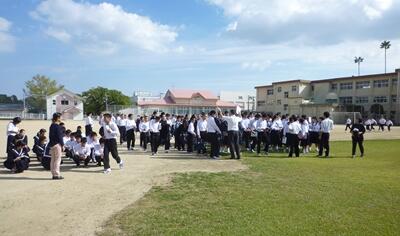 写真は、地震がおさまったのを確認して、運動場に1次避難しているところです。