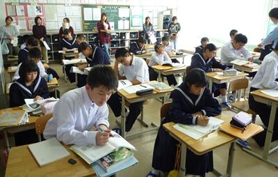 今回は、期末テストを前に、特に苦手な人も多い、数学、英語、理科を対象として実施し、その教科を比較的得意としている人がサポーターとなって、分からないところを教え合う活動を行いました。写真は上から数学(1年)、英語(2年)、理科(1・2年合同)の教室の様子です。