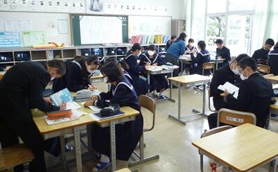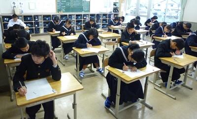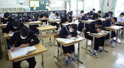 3年生は今日から2日間、最後の実力テストです。写真は理科のテストの様子です。みんな頑張っています。予防のためにマスク着用でがんばっている生徒もいますね。