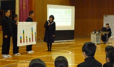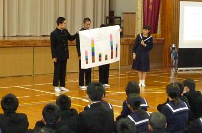 次に、生徒会執行部から、小中合同あいさつ運動やアルミ缶とペットボトルキャップの回収についての協力依頼があり、最後に2年生の学年発表がありました。