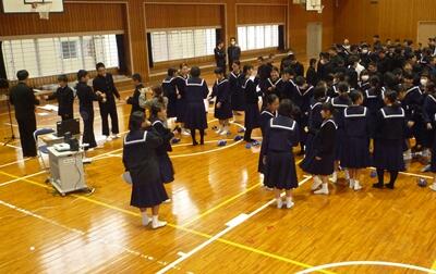 木城中学校では、本日から3学期が始まりました。朝の大清掃のあと、体育館で始業式を行いました。
