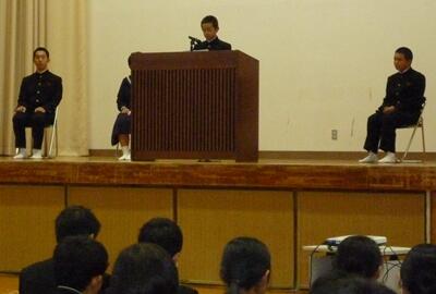 式では、1年生から中村君、2年生から尾前君、3年生から甲斐さん、生徒会執行部から2年生の林君が、代表で2学期を振り返り、発表してもらいました。写真は中村君の発表の様子です。