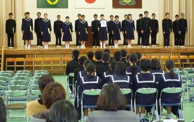その後、詩の群読や合唱を行いました。写真は合唱の様子です。曲はアンジェラ・アキさんの「手紙」です。式では、一人一人の生徒が、これからの人生における決意の言葉を漢字1文字で表し、その文字についての自分の思いを述べました。