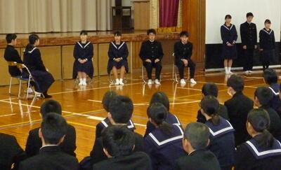 最後に、私立高校や県立高校の推薦で受験を終えた3年生の生徒たちが、面接の様子を劇にしてよい例や悪い例を示したり、受験について1・2年生へメッセージを伝えたりしました。