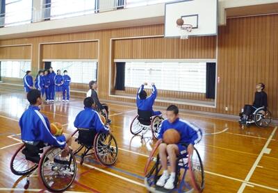車いすバスケットでは、車いすに乗ったままのドリブルの時点で悪戦苦闘。写真はシュート練習の様子ですが、重いバスケットのボールを、上半身の力だけでリングまで届かせるだけでも結構大変でした。