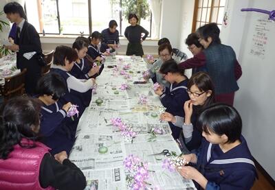 2年生の女子は、町の更生保護女性会の皆さまに指導していただきながら、明日、卒業生が胸に付けるコサージュを生花でつくりました。